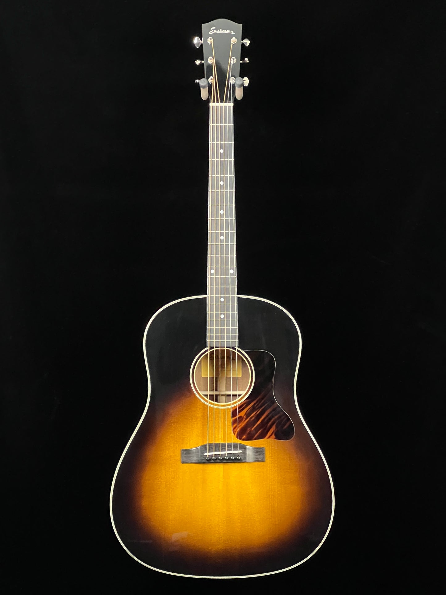 This Eastman slope shoulder acoustic guitar combines a classic design with a built-in pickup for amplification. Its distinct shape offers a warm tone, making it a versatile choice for both intimate and amplified play.