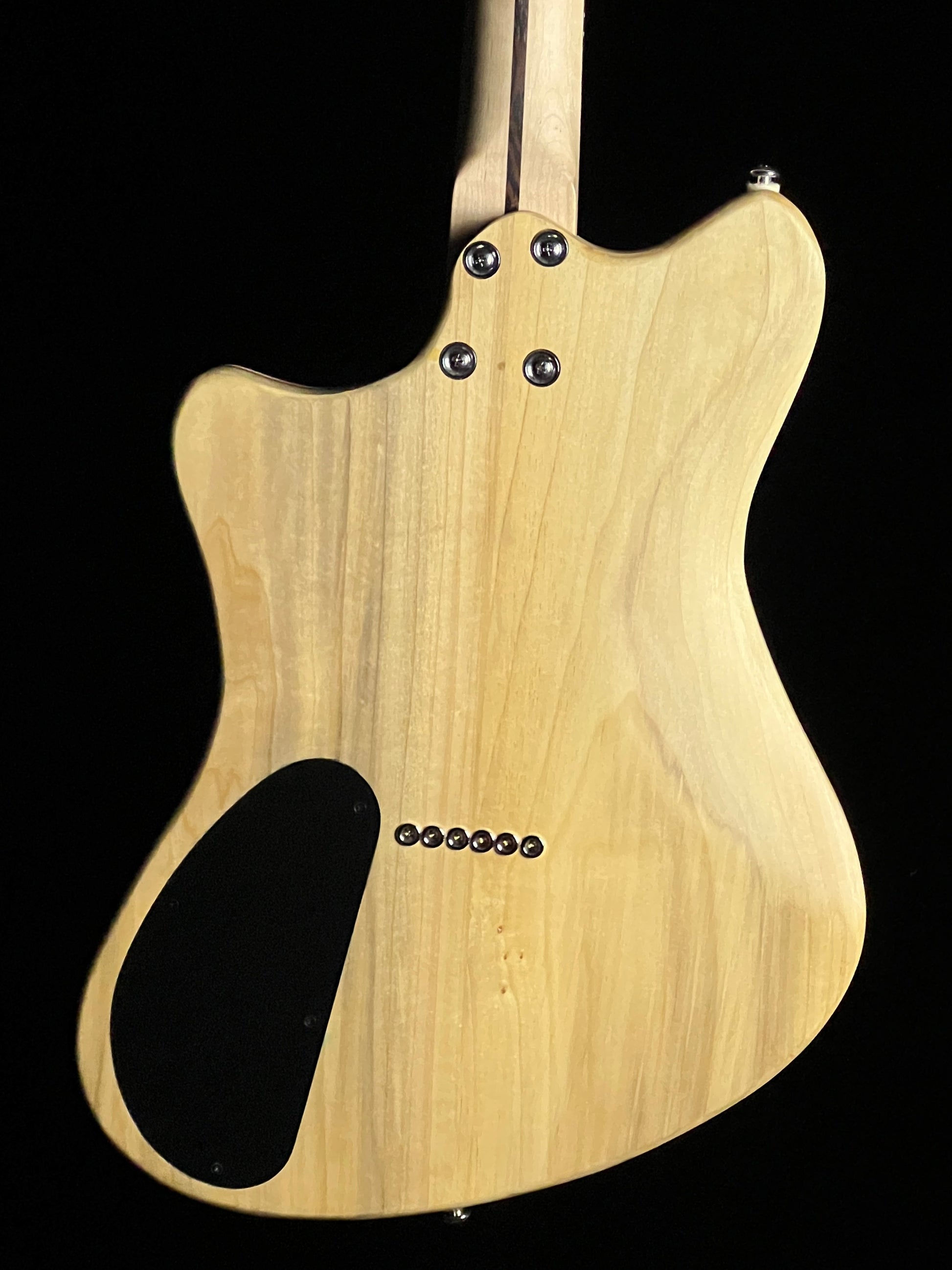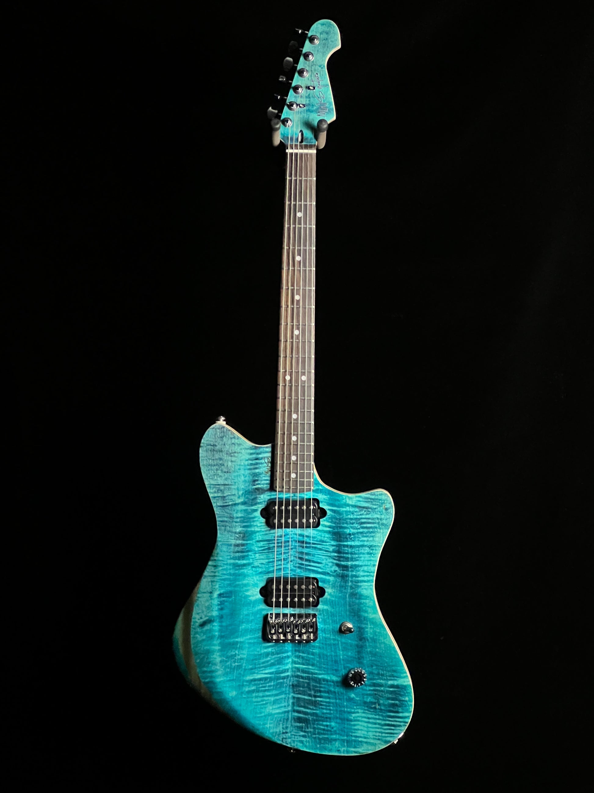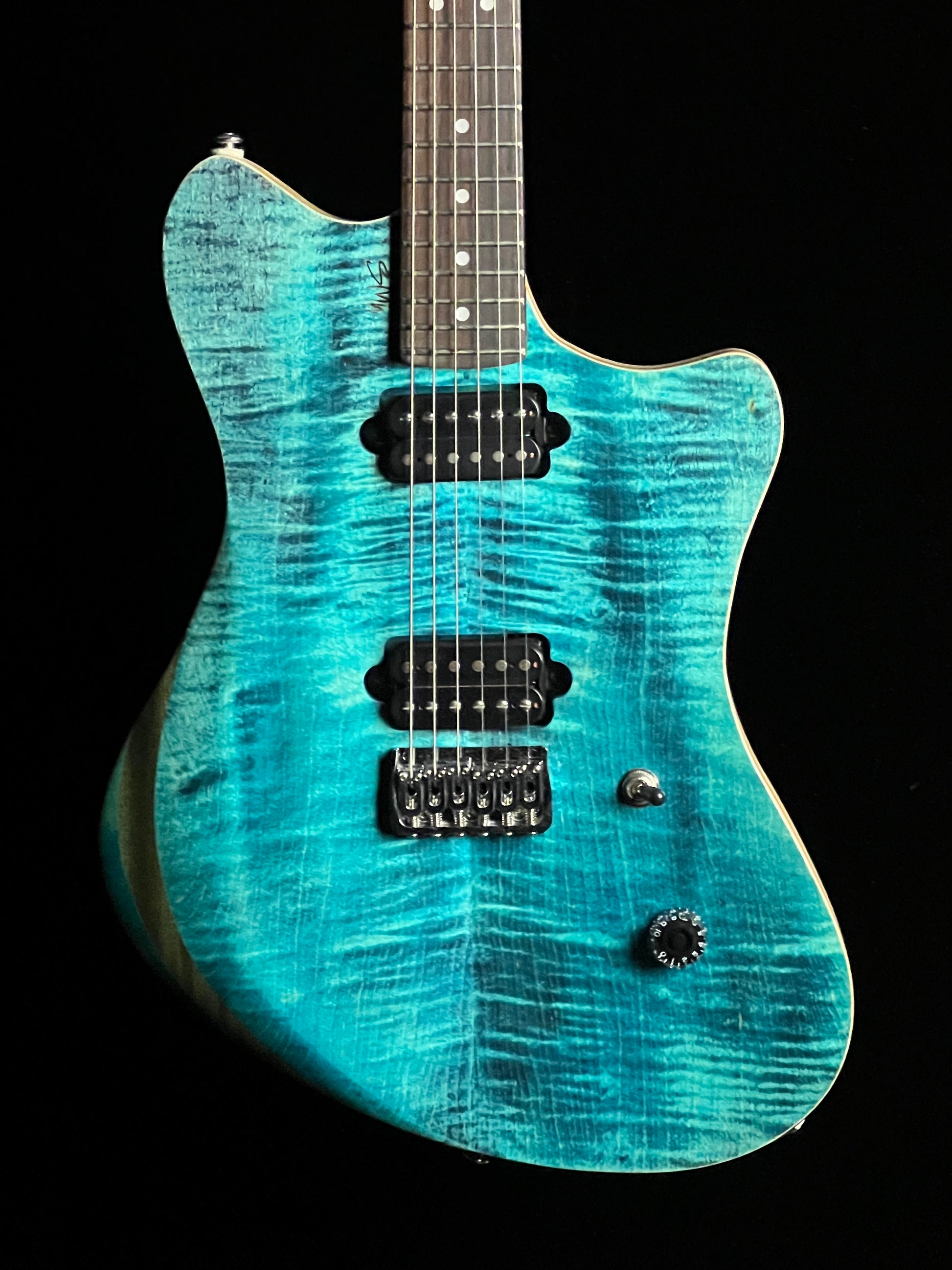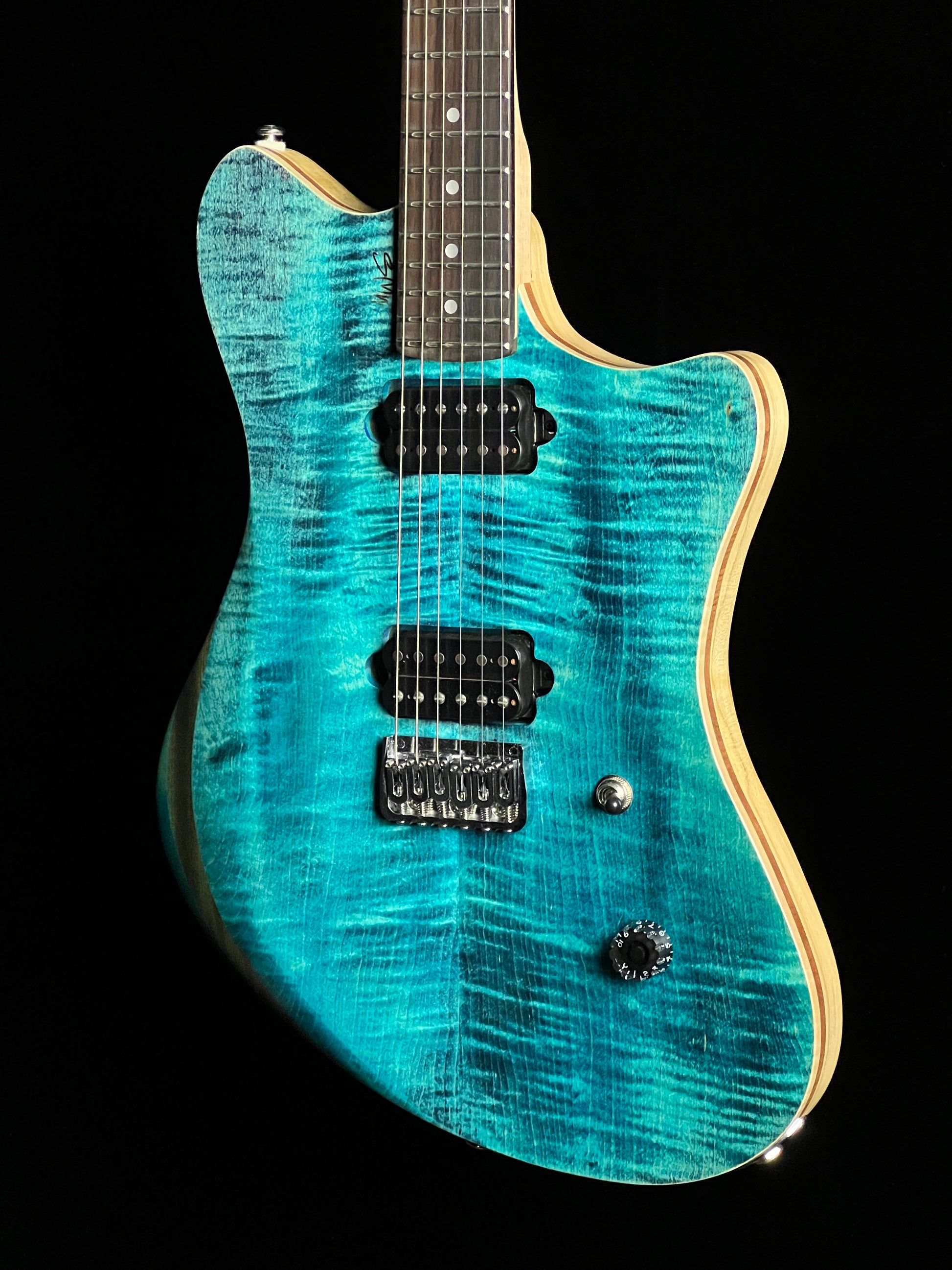 This MWS is a custom electric guitar from a boutique builder in Gordon, Alabama. It has a poplar body with a maple neck and rosewood fretboard.. Equipped with a 3-way switch, single volume control, and locking tuners.